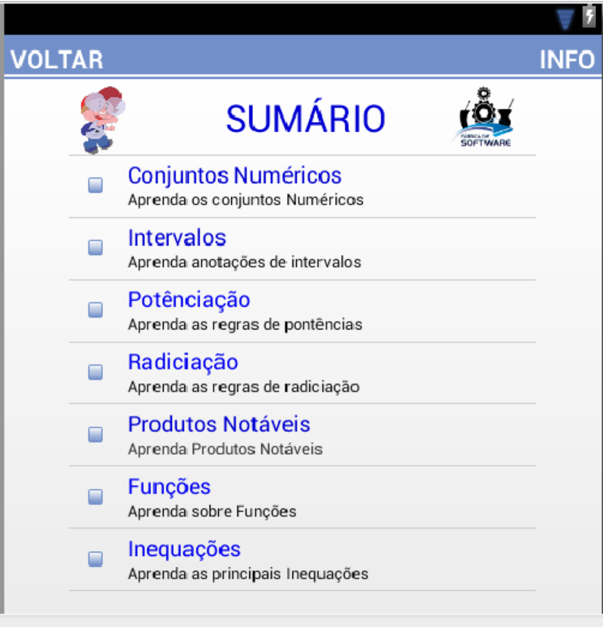 Aplicativo, com versões gratuitas e pagas, que transforma a rotina matemática em um exercício lúdico e interativo. Voltado para estudantes do ensino fundamental, no Rei da Matemática (disponível para Android e iOS) é preciso desenvolver um reino (pessoal e ambiental) por meio da realização de diversos problemas matemáticos. São abordadas questões aritméticas de adição, subtração, raízes e frações, entre outras.Matemática Elementar
