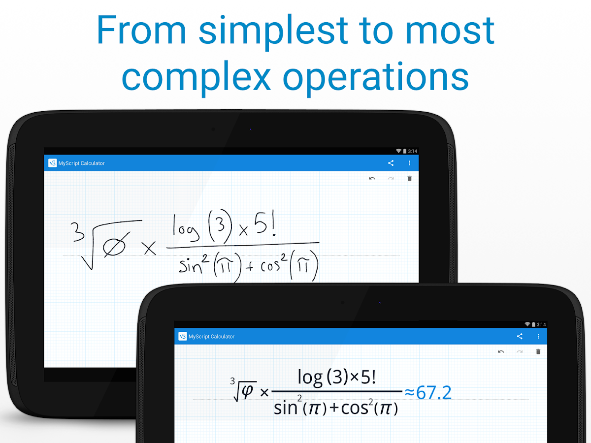 Aplicativo gratuito para estudantes do Ensino Médio. Conta com diversos fundamentos matemáticos, permitindo que os estudantes identifiquem melhor as próprias dificuldades e, com isso, possam trabalhá-las com exercícios e aulas voltados para conteúdos variados, como funções, intervalos, potenciação, radiciação, produtos notáveis, conjuntos numéricos e inequações, por exemplo.MyScript Calculator